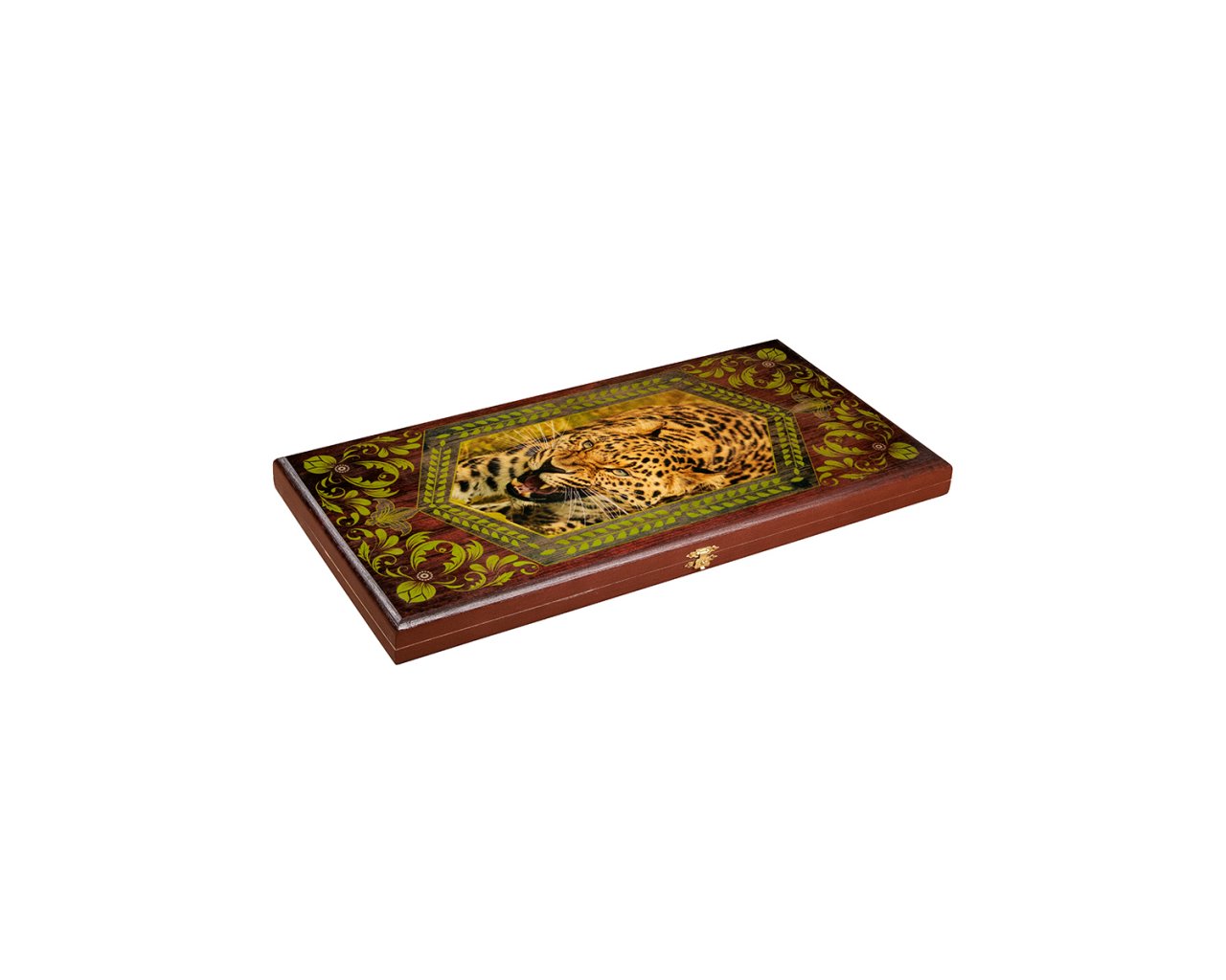 Нарды упакованы в деревянный лакированный кейс, декорированный изображением леопарда. Кейс закрывается на металлический замок. Внутренняя часть кейса представляет собой игровое поле. В наборе - 2 игральных кубика и деревянные шашки. На внешней стороне кейса изображено игровое поле для игры в шашки.