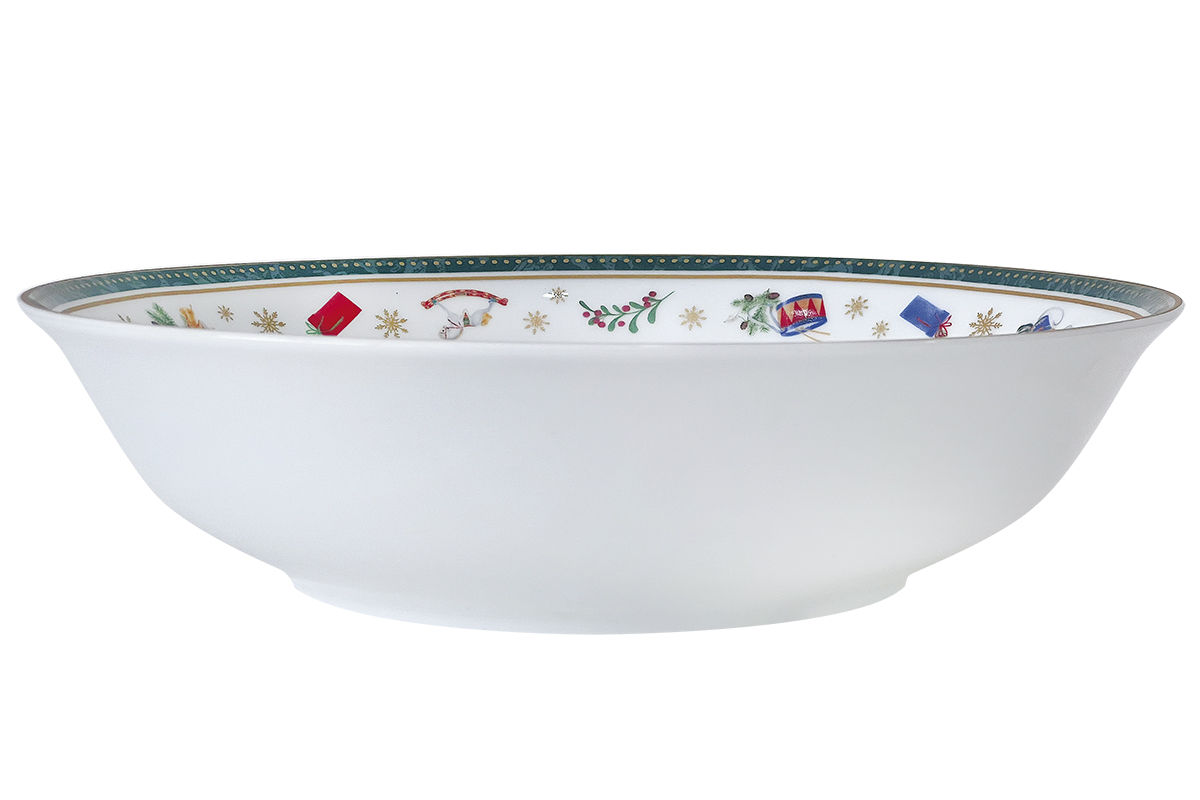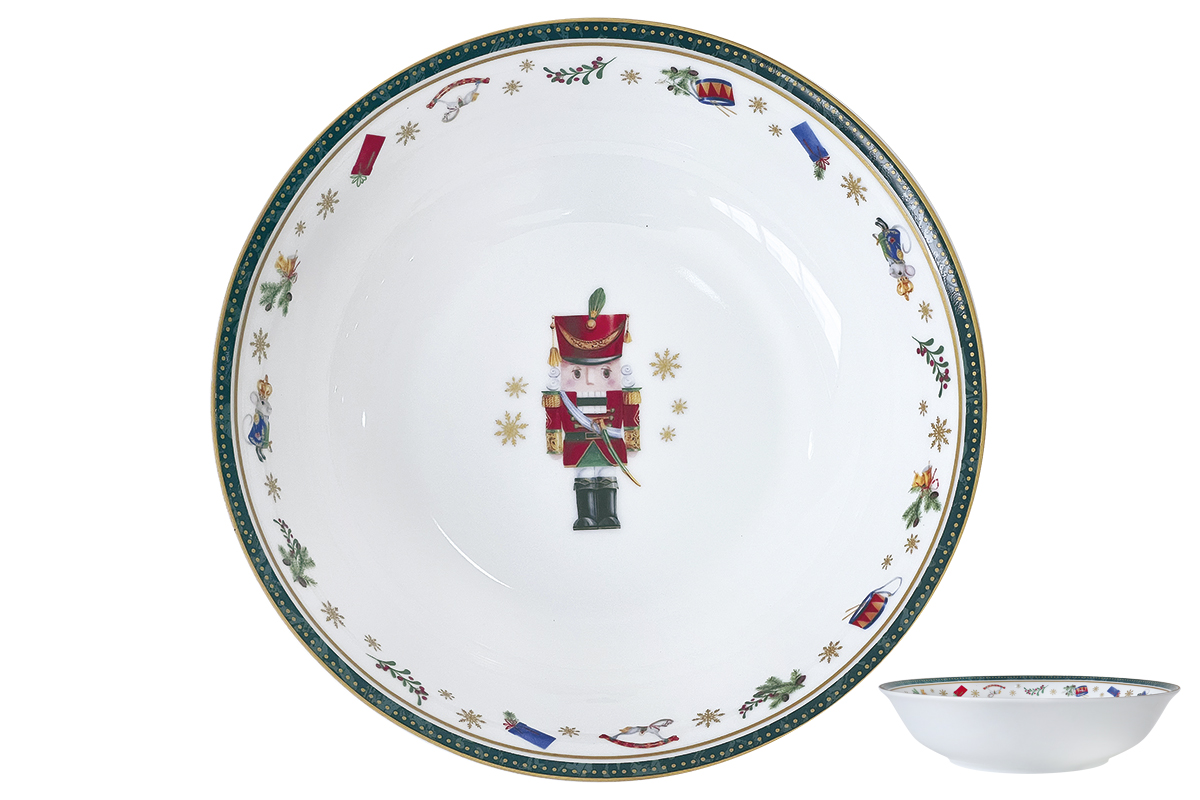 Эксклюзивный салатник выполнен из высококачественного фарфора и декорирован по краю новогодним орнаментом. На дне изделия имеется изображение в виде знаменитого Щелкунчика.  Ваша уникальная праздничная сервировка станет особенной и неповторимой.