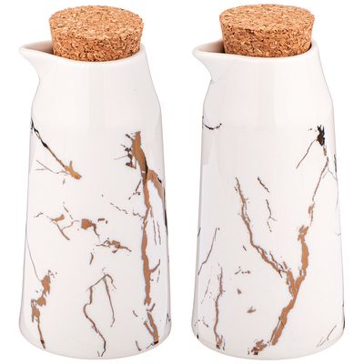 Набор для масла и уксуса "Фэнтези" изготовлен из упрочненного фарфора. Емкости представлены в белом цвете с золотыми брызгами и плотно закрываются пробкой. Такие изделия не позволят попасть внутрь посторонним запахам и влаге, а также предотвратят случайное излитие содержимого.
