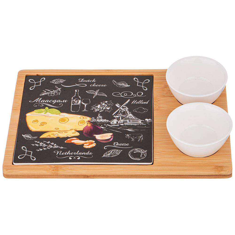 Стильный набор поможет по-новому посмотреть на приготовление блюд. Комплект состоит из фарфоровой разделочной доски с отделкой деревом и двух фарфоровых пиал. Такой функциональный набор будет эффектно смотреться при подаче и сервировке разнообразных закусок.