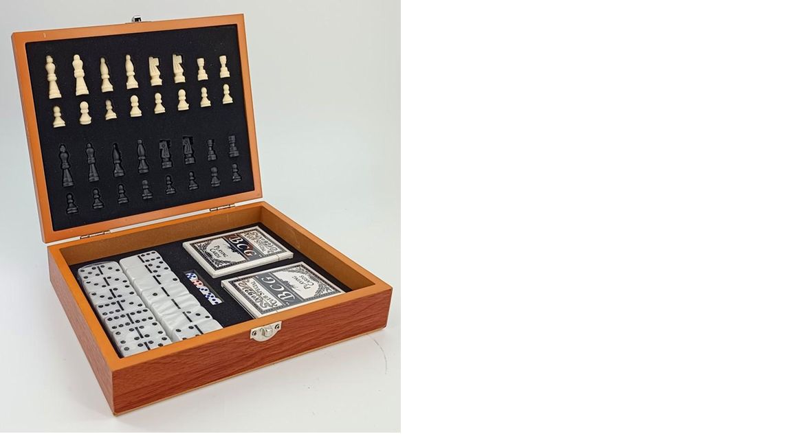Набор игр выполнен из качественных материалов и отличается превосходным внешним видом. Комплект включает в себя шахматы, набор фишек домино и покерные карты с игральными кубиками. Доска для игры выполняет роль футляра, имеющий ячейки для предметов.