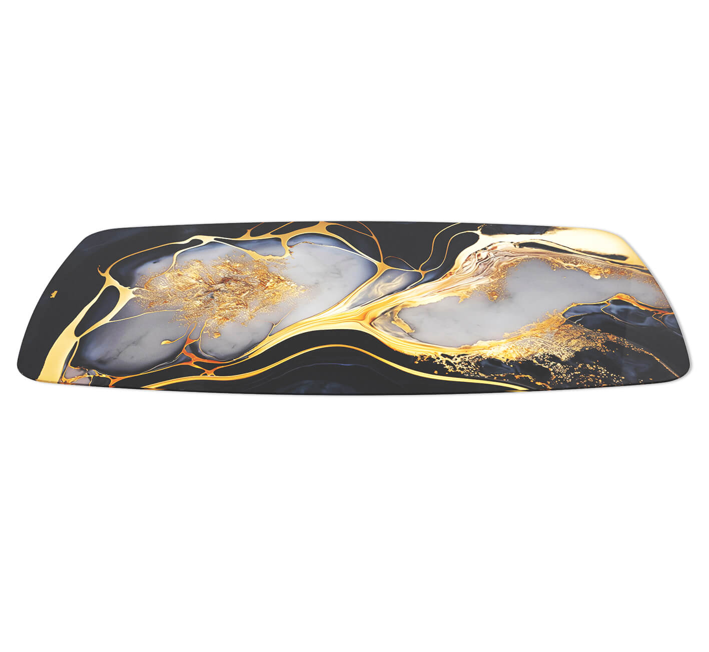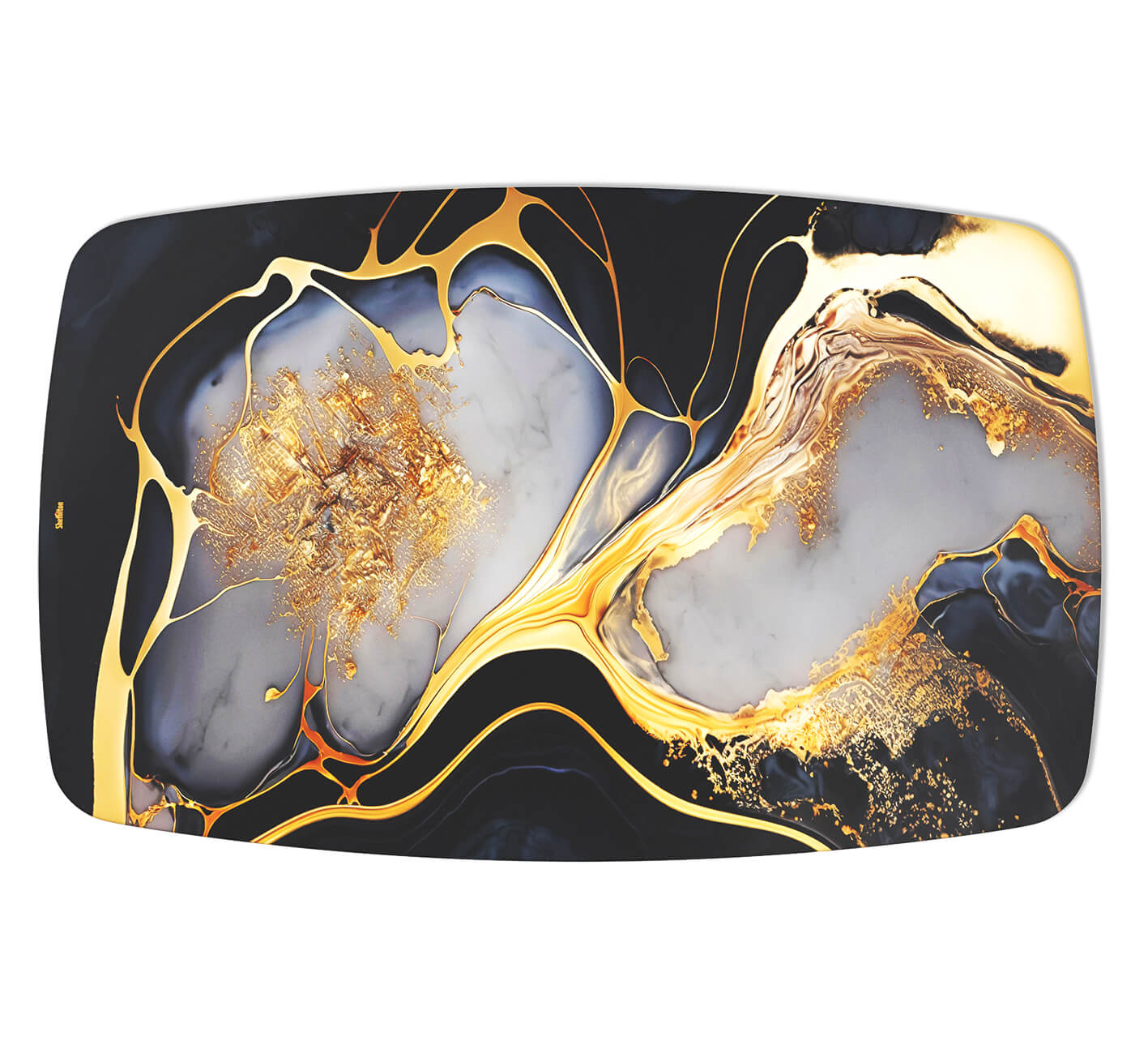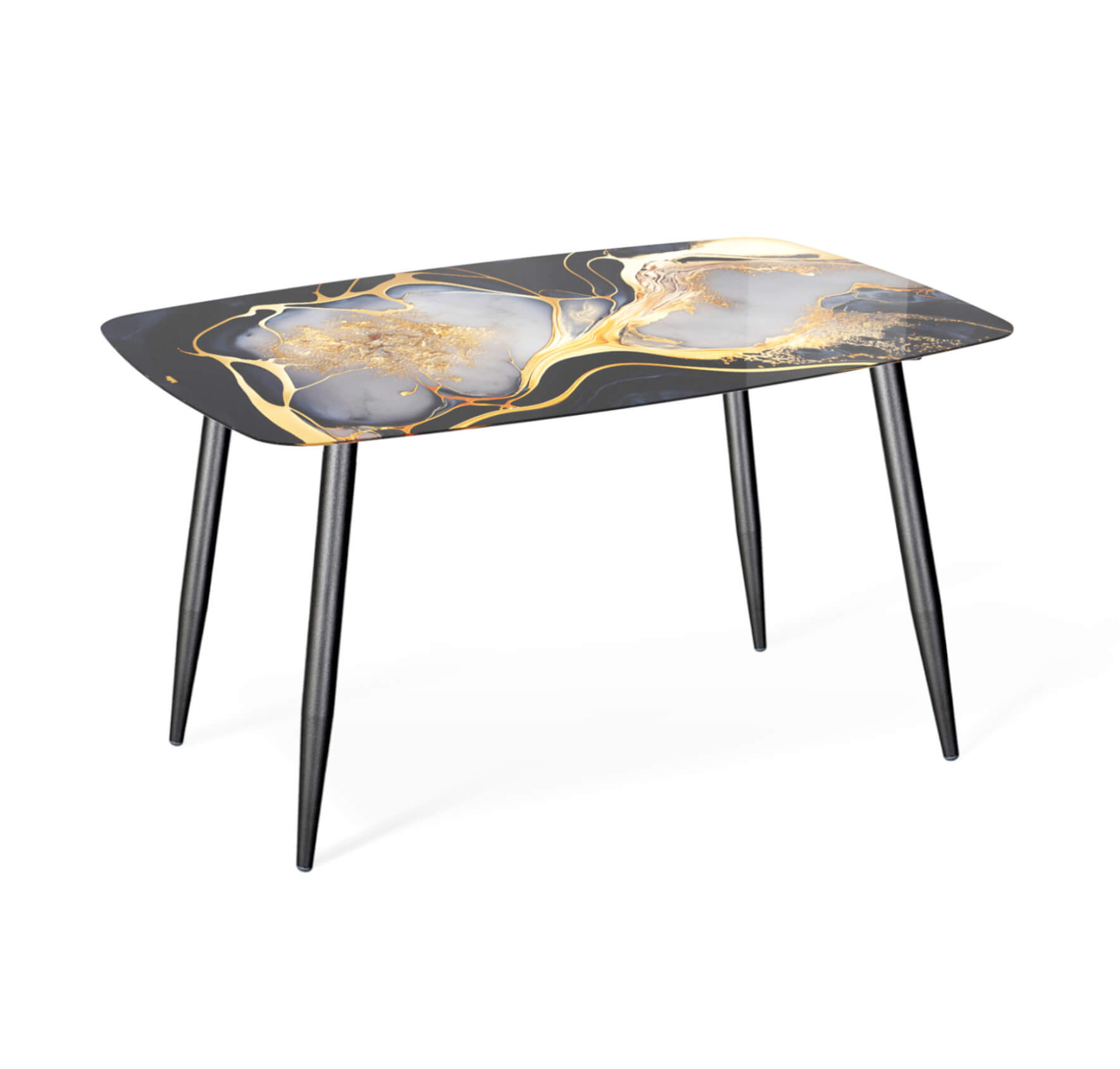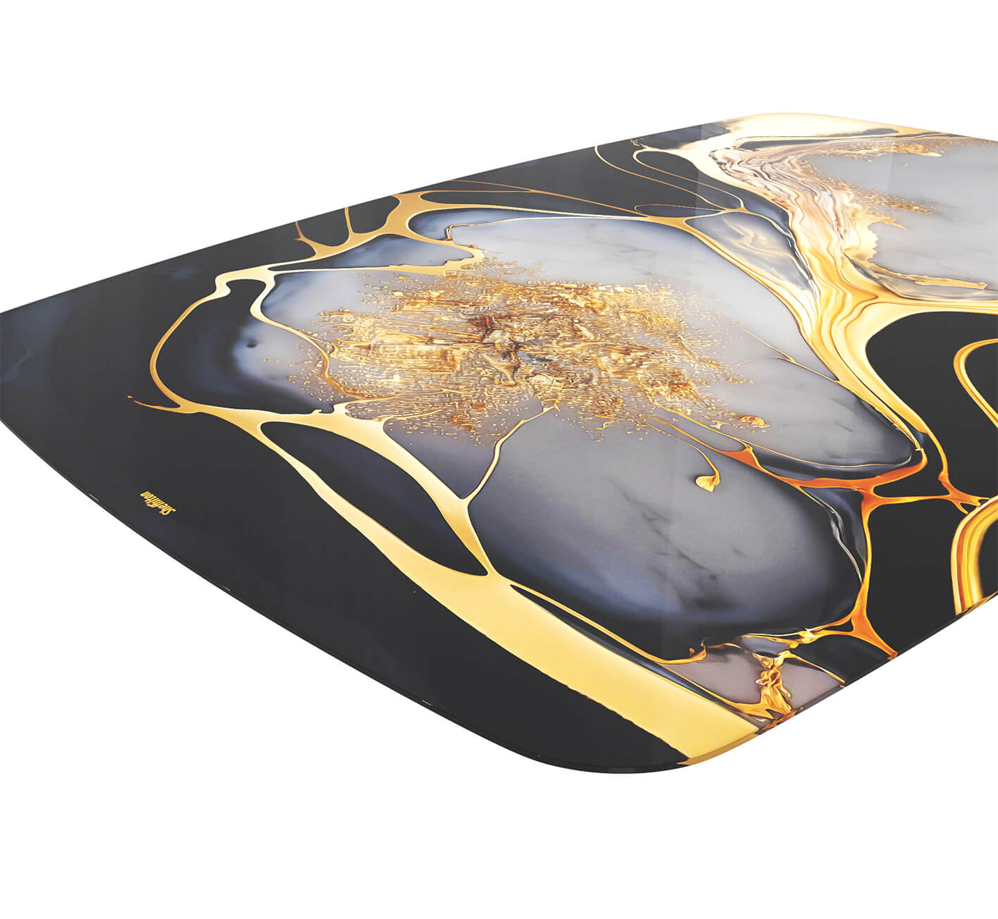 Столешница выполнена из закаленного стекла с ультрафиолетовой печатью. Одним из главных преимуществ закаленного стекла является его стойкость к высоким температурам, вибрационным нагрузкам, ударам и царапинам. Также стекло обладает высокой ударной вязкостью - энергия от столкновения с бьющим предметом распределяется относительно продолжительное время (по сравнению с обычным стеклом), что приводит к разрушению на очень мелкие осколки. Стекло закреплено на МДФ с отступом 50 мм.