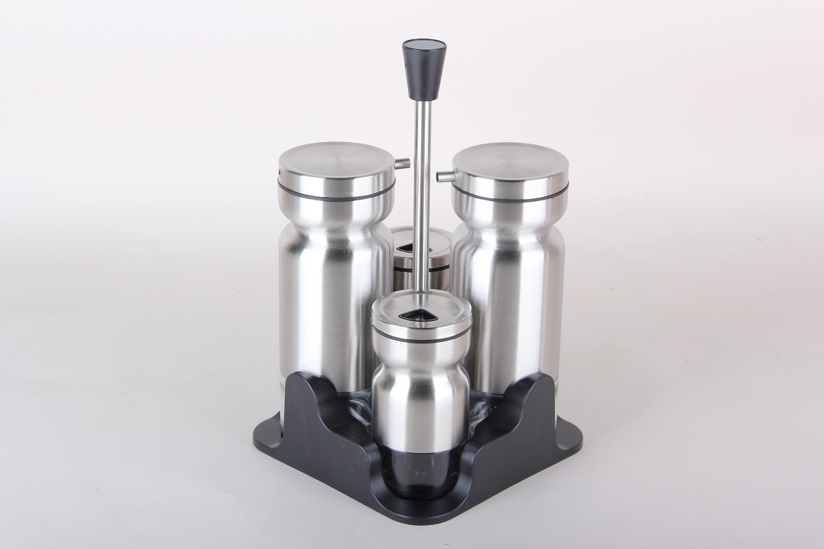 Удобный набор состоит из четырех предметов: две бутылки под масла, бальзамик, соевый соус и две емкости для соли, перца или специй. Такой функциональный набор располагается на удобной подставке, оснащенной ручкой, за которую его удобно перемещать в любое место.
