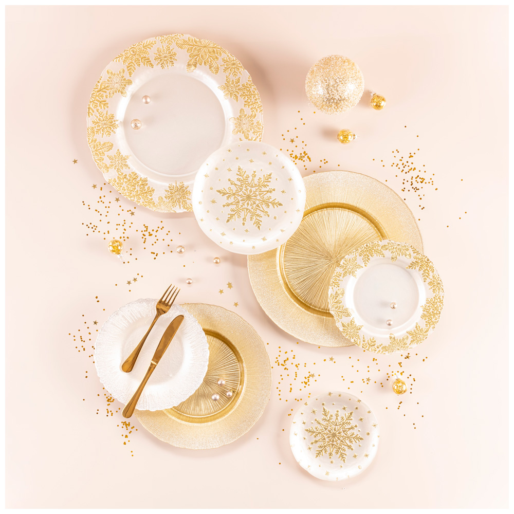 Праздничная тарелка выполнена из качественного турецкого стекла. Бордюр в виде золотых снежинок добавляет посуде оригинальности.
