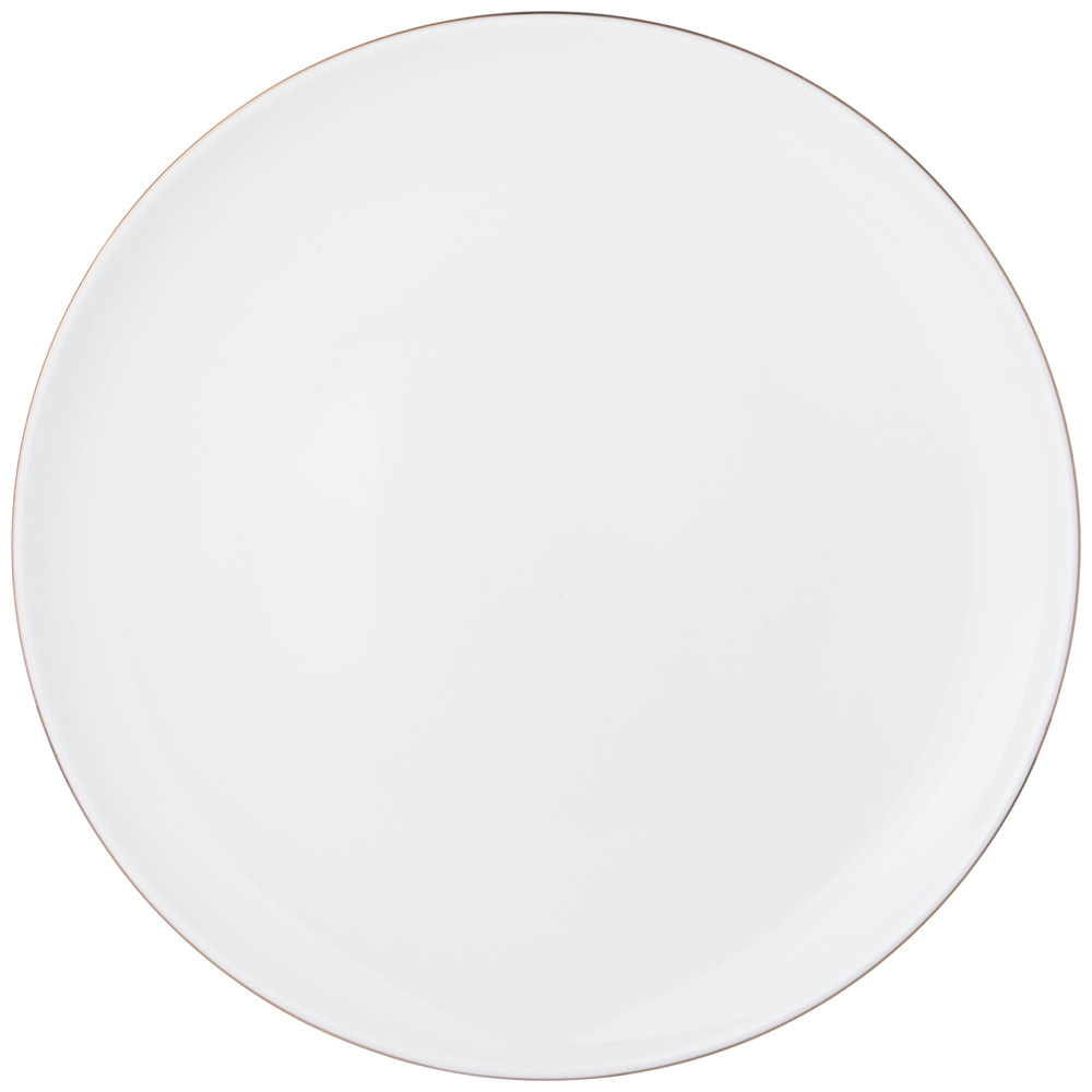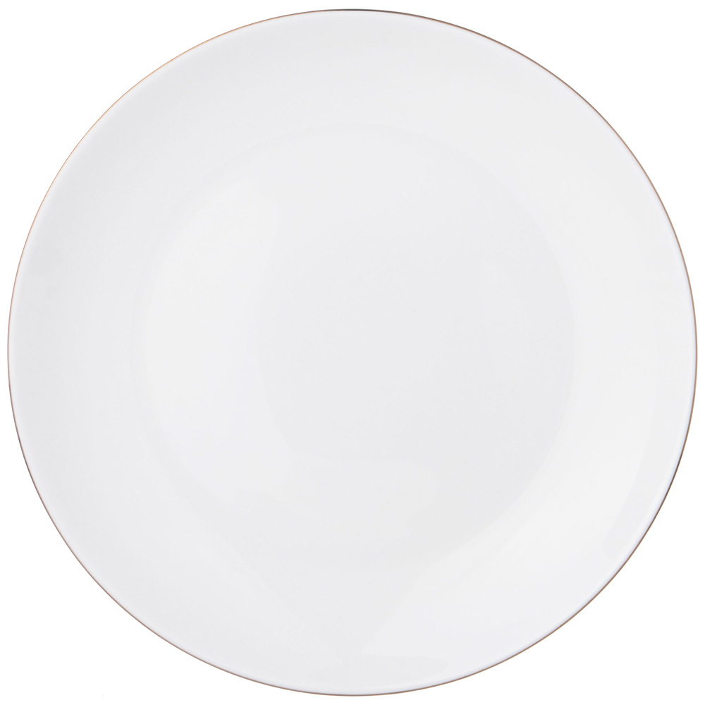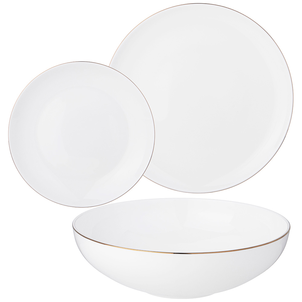 Обеденный набор выполнен из костяного фарфора с изящной золотой окантовкой. Легкий, но плотный белоснежный фарфор издает привлекательный мелодичный звук.