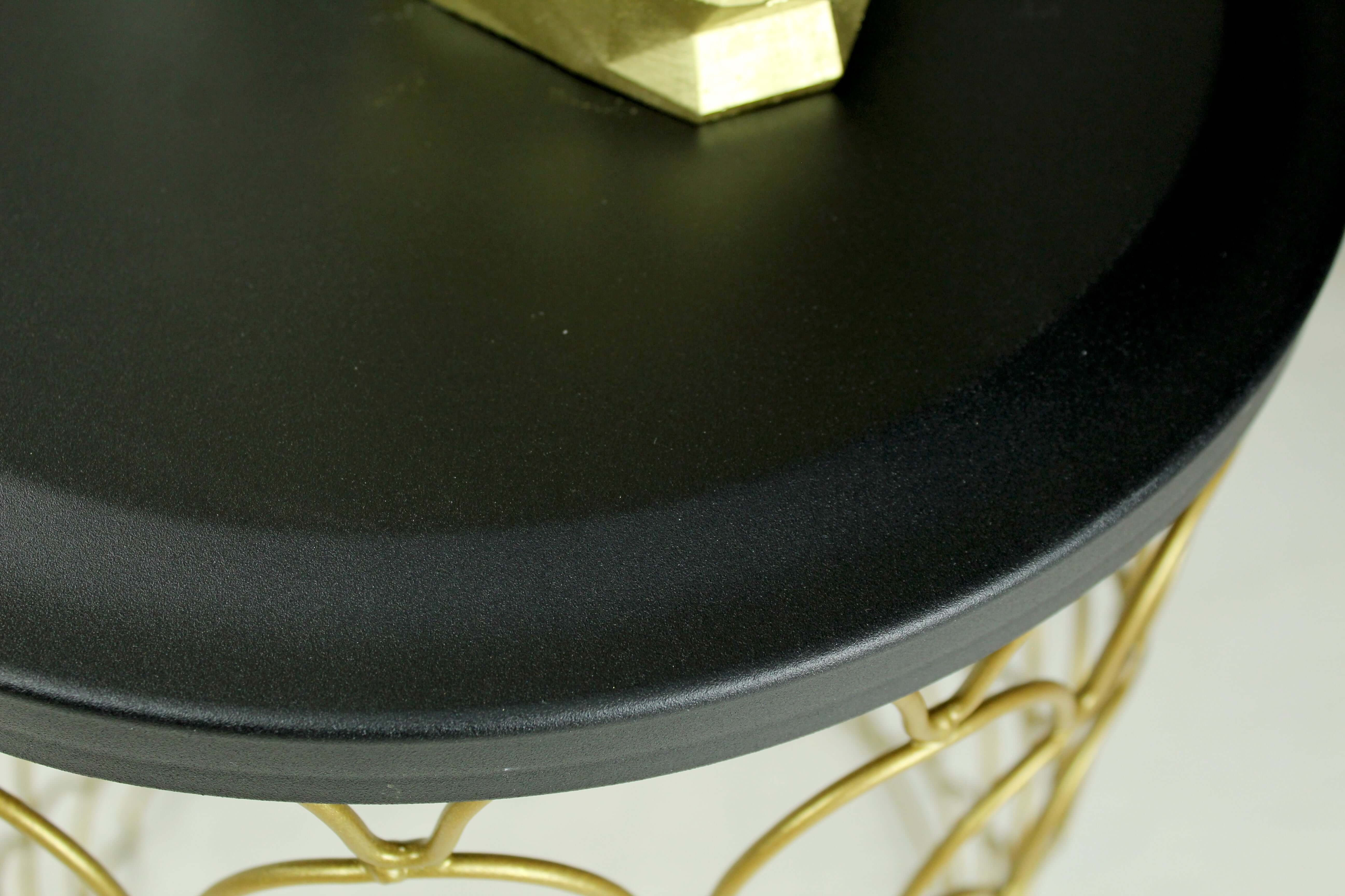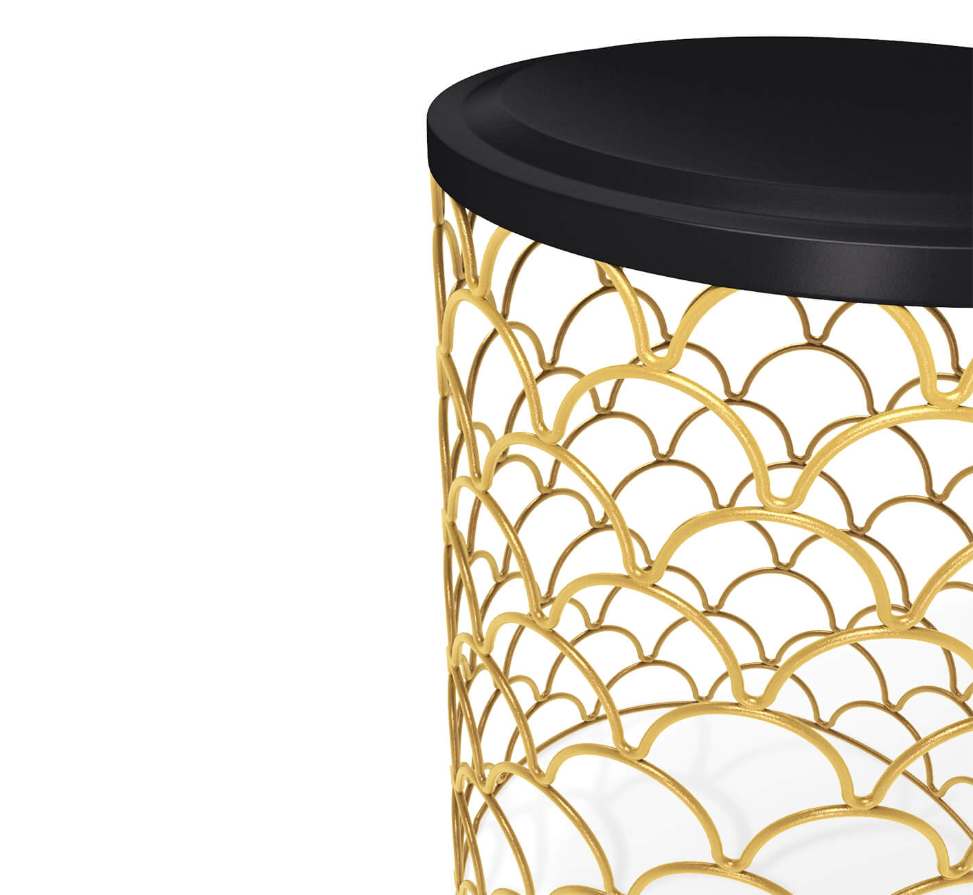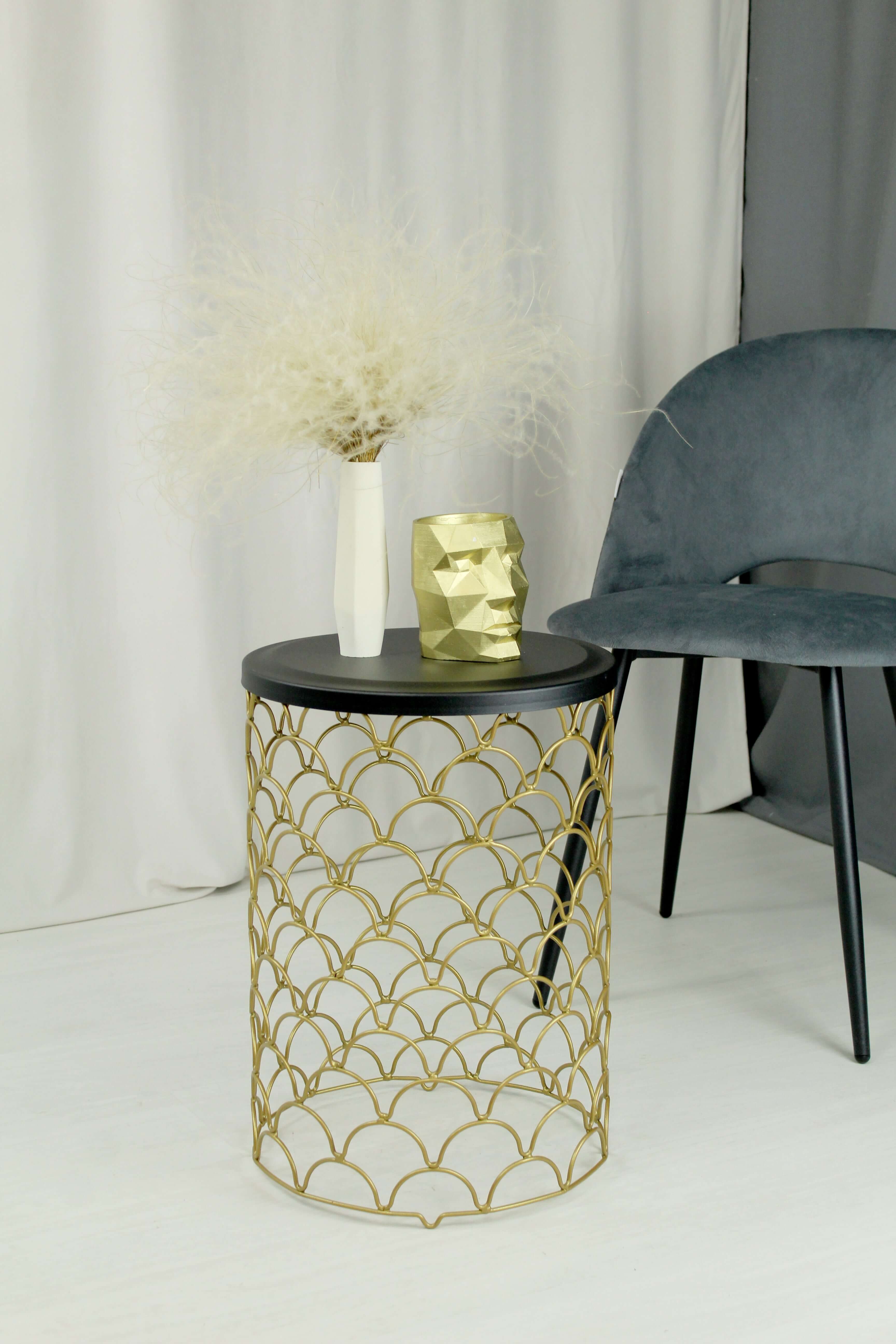 Отличительная особенность столика – золотое основание в стиле арт-деко в форме усеченного цилиндра. Оно выполнено из фигурно изогнутых металлических прутьев. Орнамент напоминает чешую фантастической рыбы или пайетки на вечернем платье.