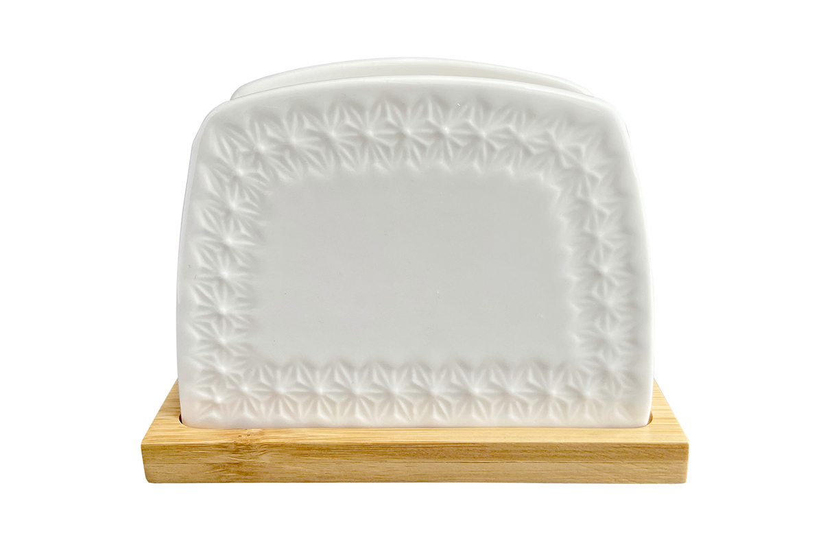 Ни один праздничный и повседневный стол не обойдется без красивой сервировки стола. Салфетница "Снежная королева" изготовлена из облегченной керамики и расположена на удобной компактной подставке из бамбука.