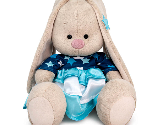 Очаровательная Ми всегда удивляет своими красивыми и элегантными нарядами. В этот раз на Зайке можное звёздном платье. Лиф сшит из синего трикотажа, а юбочка сшита воланами из шелковистого сатина. На ушке у Зайки пластиковая голубая звёздочка.