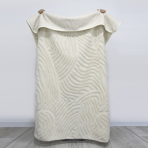 Шерстяной мягчайший плед с рельефным объемным рисунком приятен на ощупь за счет выпуклых полос. Края пледа обработаны мягким кантом. Лицевая часть изделия с фактурной поверхностью, а изнаночная сторона - с гладкой.