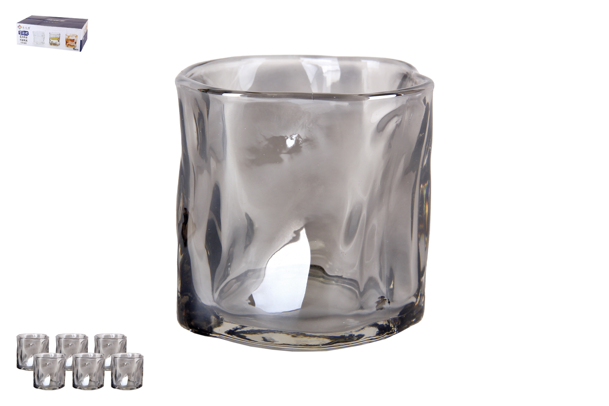 Комплект бокалов и выполнен из качественного стекла. Стаканы представлены в оригинальной форме с выпуклым узором и устойчиво стоят на поверхности за счет утолщенного дна.