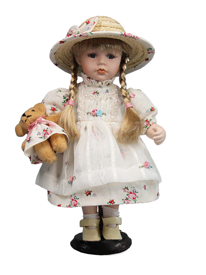 Очаровательная куколка одета в нежное платье и соломенную шляпку, в руках - плюшевый мишка. Тело куклы мягконабивное, руки, ноги и голова выполнены из фарфора.