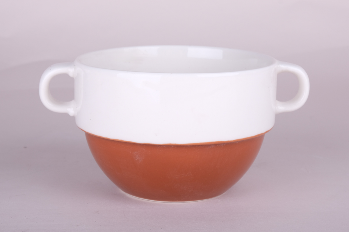 Бульонница с двумя ручками выполнена из качественного фарфора. Изделие представлено в цветном дизайне.