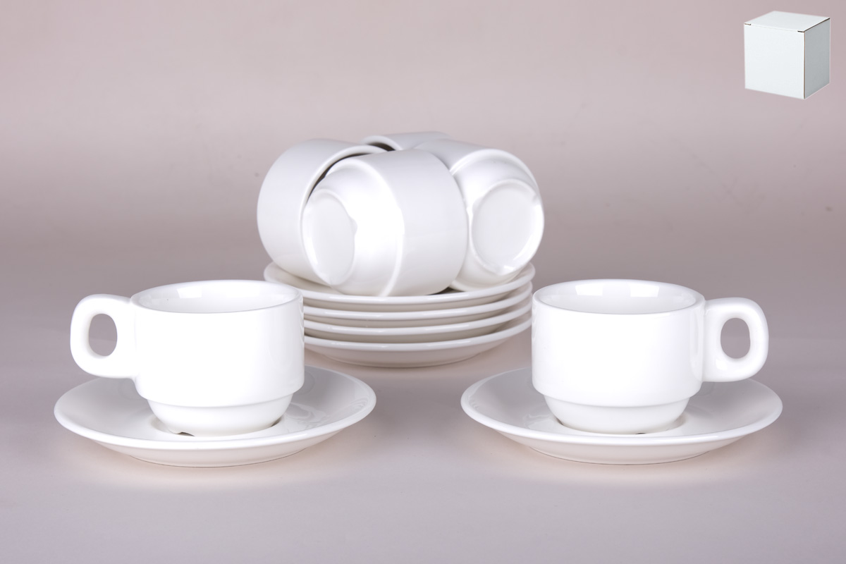 Кофейный набор изготовлен из высококачественного белого фарфора и рассчитан на 6 персон. Лаконичный дизайн делает комплект одновременно стильным и повседневным.