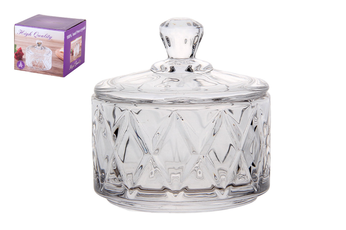 Сервировочная ваза в изысканном дизайне выполнена из толстого узорного стекла. Миниатюрная емкость устойчиво стоит на ровной поверхности и закрывается крышкой.