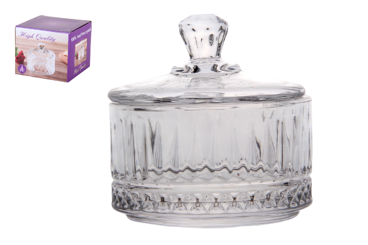 Сервировочная фаза в изысканном дизайне выполнена из толстого узорного стекла. Миниатюрная емкость устойчиво стоит на ровной поверхности и закрывается крышкой.