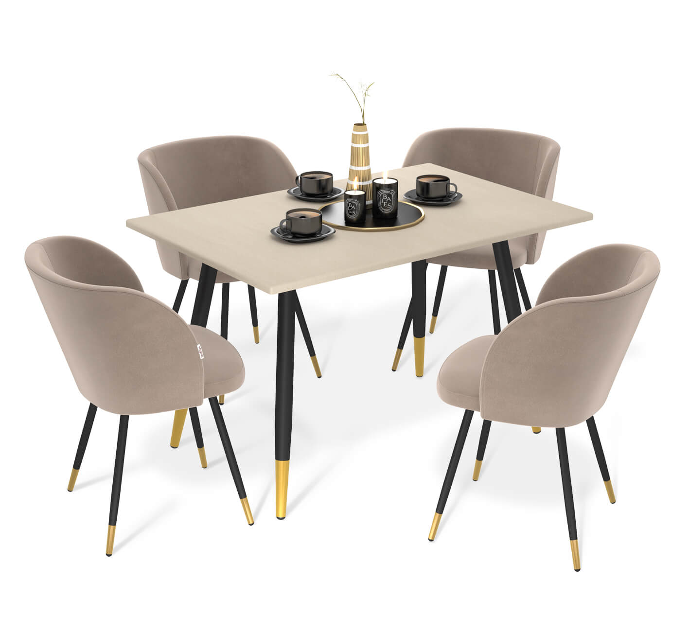 Оригинальную нотку придает золотое напыление в нижней части опоры стола и стульев. Четкое разделение черного и золотого прекрасно гармонируют со столешницей и сидением стула в аналогичном стиле черный муар/золото.