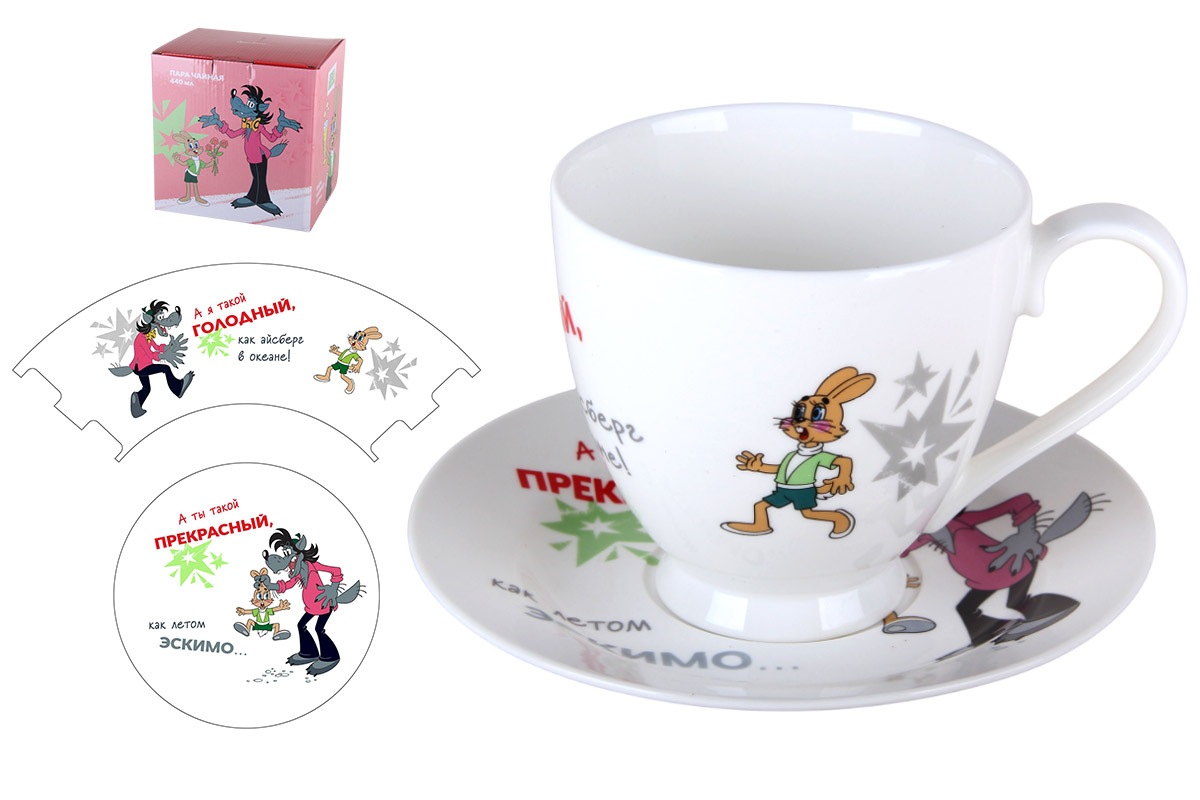 Чайная пара "Ну погоди" выполнена из качественного фарфора с глянцевой глазурью. Изделие декорировано изображением любимых героев из всеми известного мультфильма и обязательно создаст хорошее настроение.