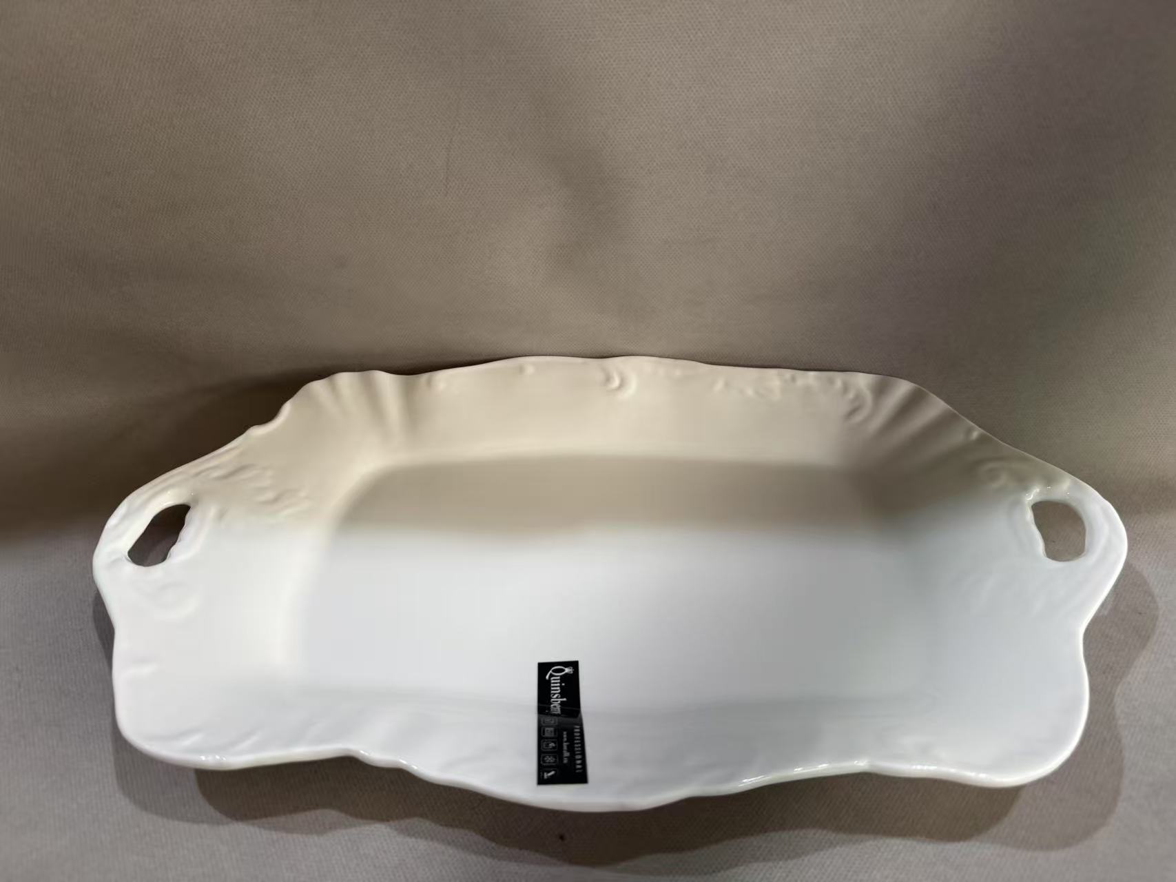 Сервировочное блюдо выполнено из белого фарфора. Посуда представлена в оригинальном дизайне, который привлекает внимание и обязательно украсит сервировку стола.
