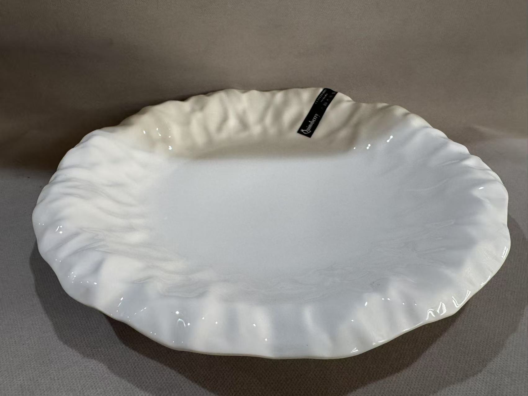 Сервировочное блюдо выполнено из белого фарфора. Посуда представлена в оригинальном дизайне, который привлекает внимание и обязательно украсит сервировку стола.