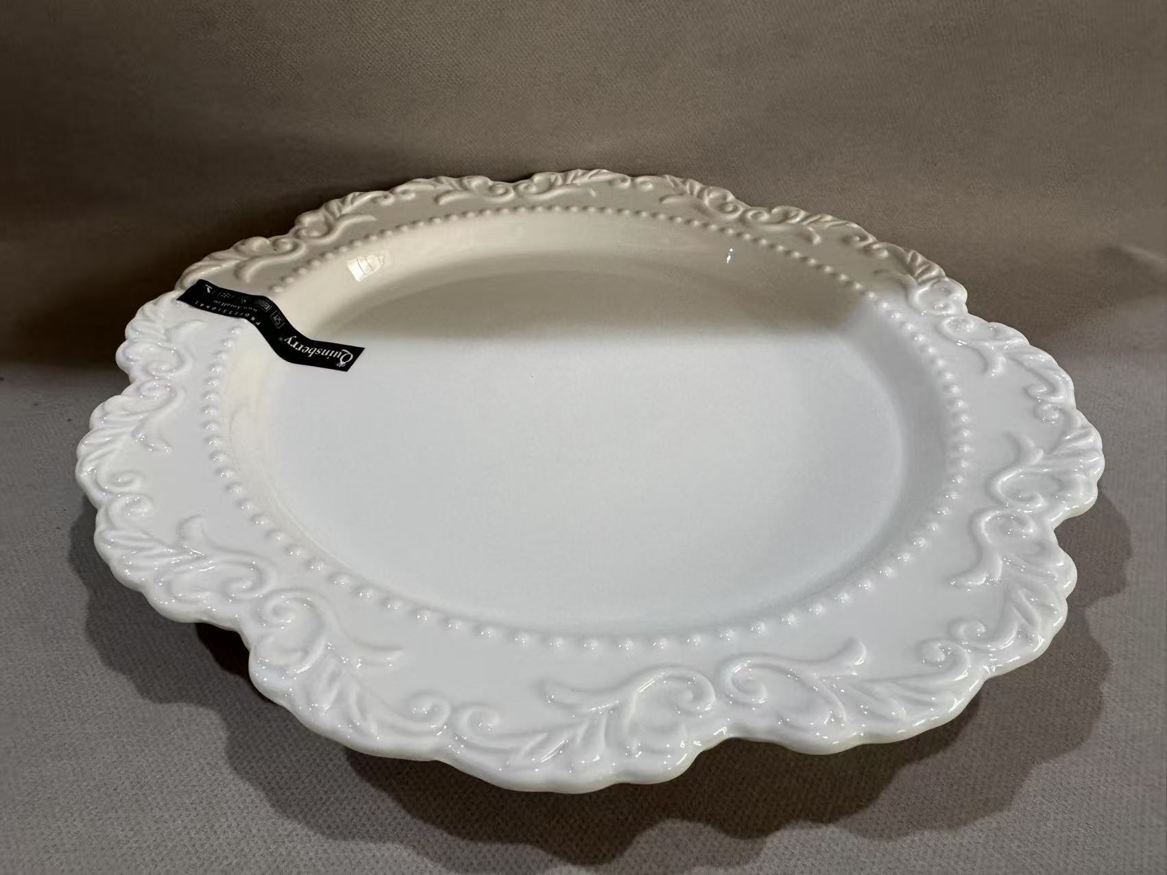 Нарядное блюдо выполнено из белого фарфора. Посуда декорирована выпуклым узором, который добавляет нежности дизайну.
