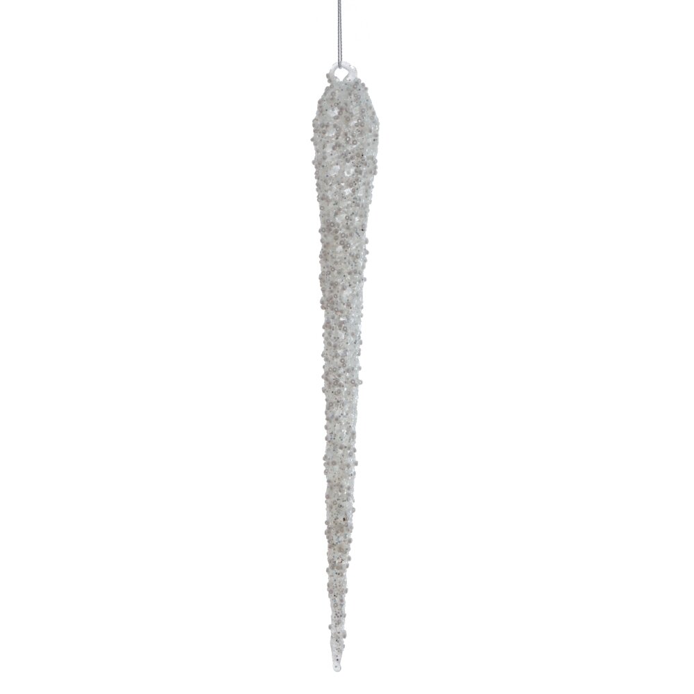 Новогоднее украшение с подвесом представлено в виде сосульки. Роскошное изделие украшено выпуклым блестящим декором.