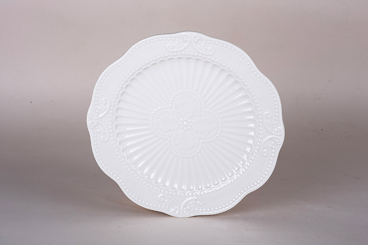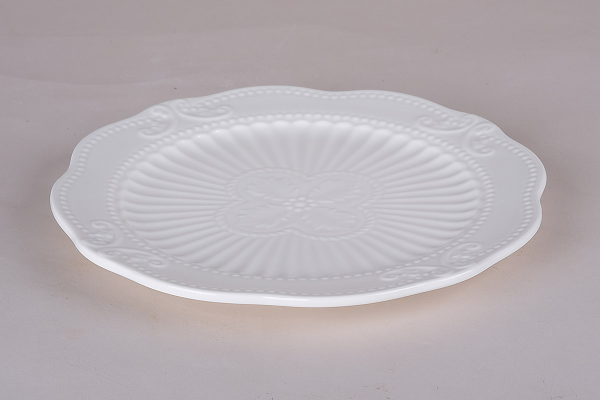 Десертная тарелка выполнена из белого фарфора. Посуда декорирована выпуклым узором в классическом стиле.