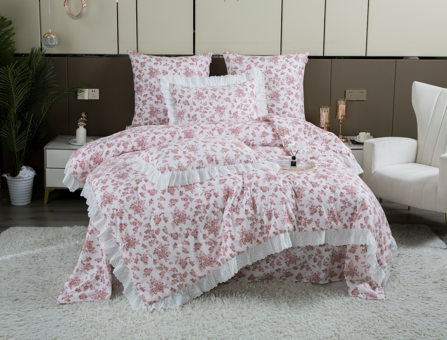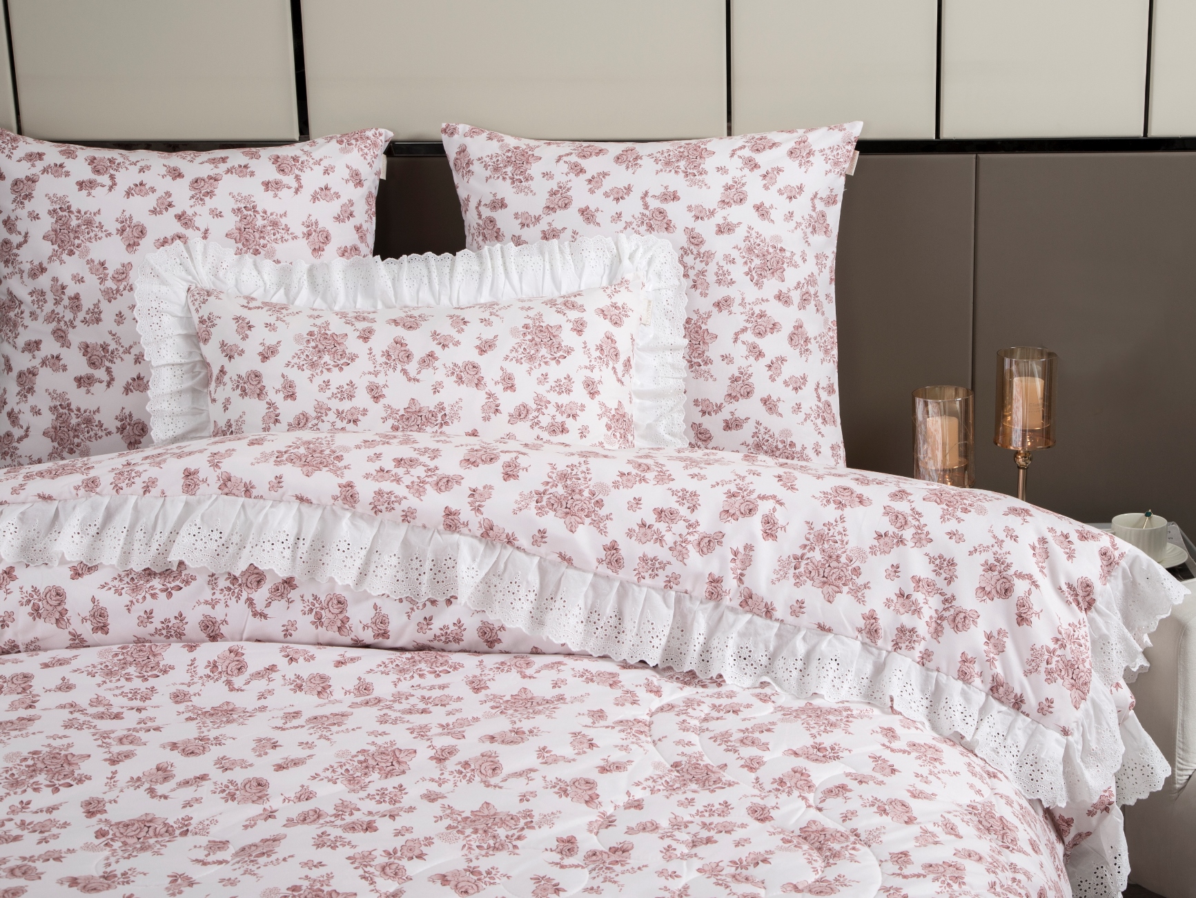 Элегантный романтичный комплект сочетает в себе уникальный стиль и комфорт, где каждый элемент продуман до мелочей. Высококачественные материалы: баланс природы и технологий. Постельное бельё выполнено из хлопка со смесовой нитью. Изысканный дизайн с отделкой элегантным кружевом "Ришелье" из утонченного натурального хлопкового батиста. Стёганое одеяло с наполнителем из эко-волокна микрогель - лёгкое, воздушное с потрясающей способностью пропускать воздух, что создаёт ощущение невесомости и делает его идеальным для использования круглый год.