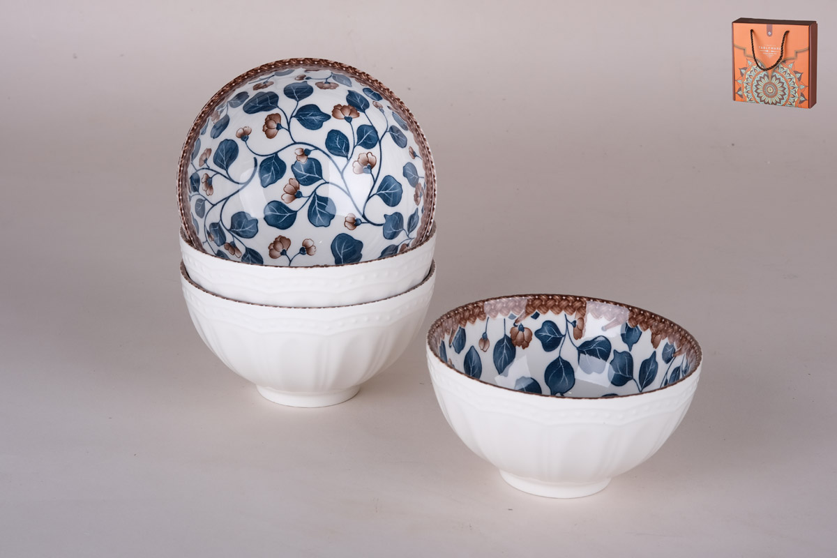 Нарядный набор пиал изготовлен из качественного фарфора. Комплект рассчитан на 4 персоны. На каждом изделии нанесен интересный узор.