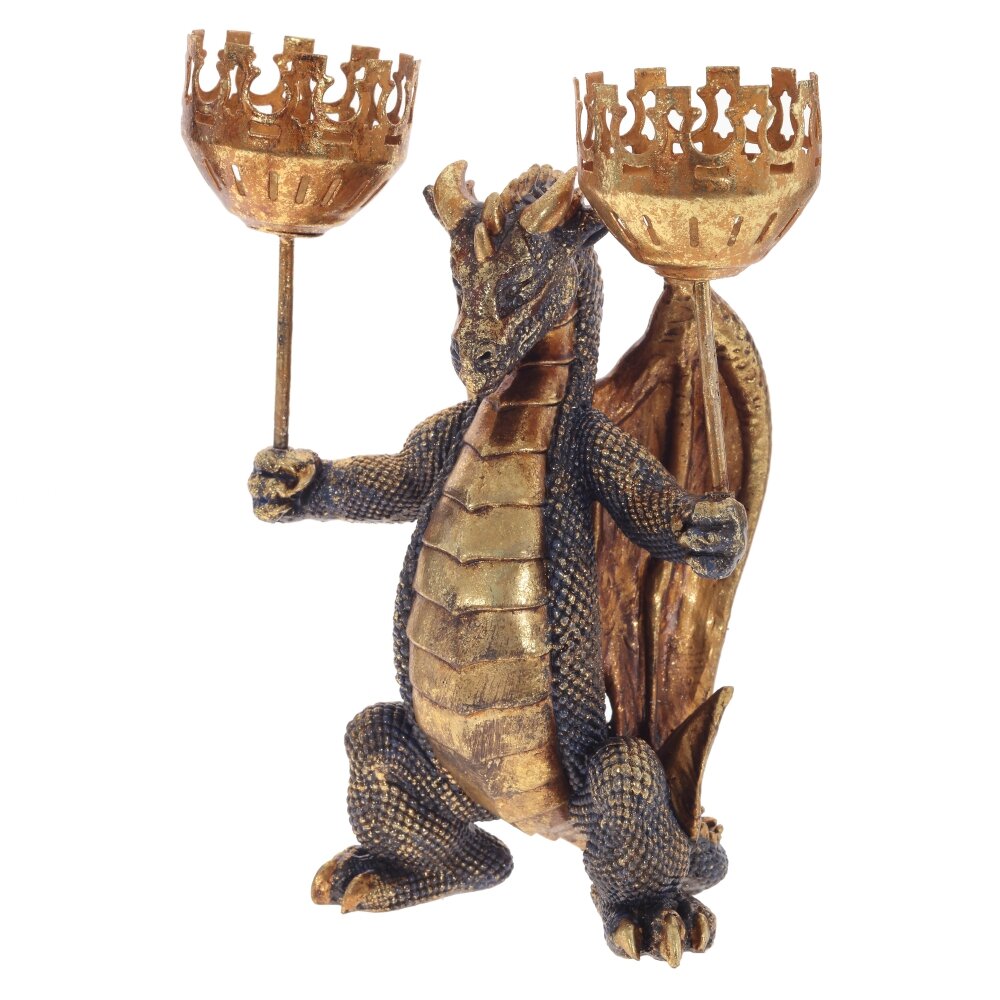 Роскошный дракон с двумя подсвечниками в руках смотрится по-королевски. Прелестный сувенир, который украсит любой интерьер. Изделие рассчитано на 2 свечи диаметром 6 см.