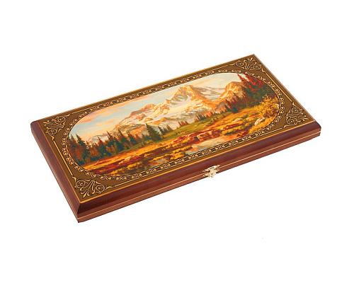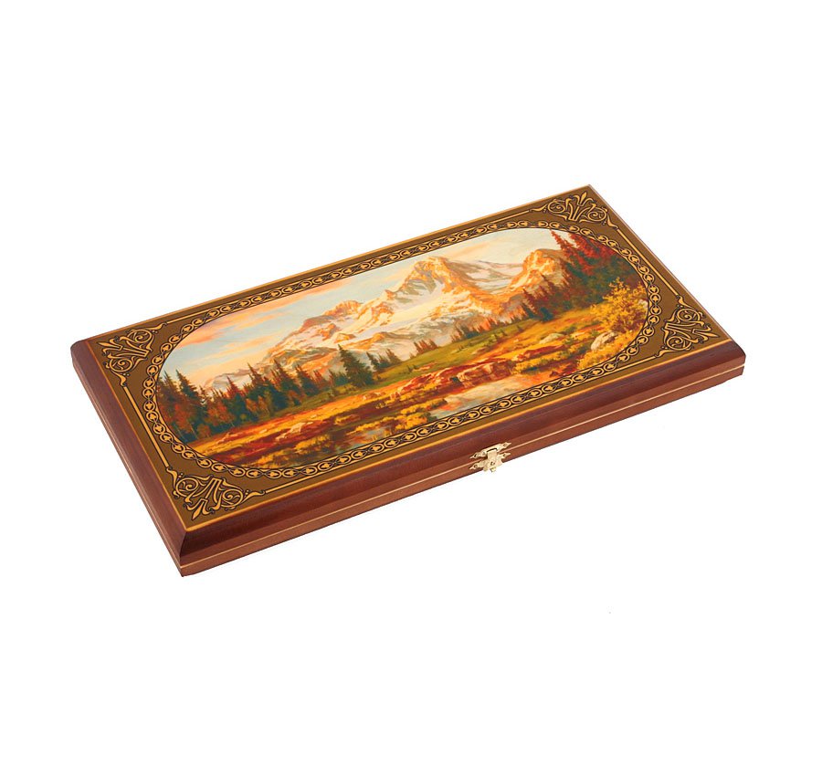 Большой набор игр "Горы" упакован в деревянный лакированный кейс, оформленный красочным изображением и дополнительным полем для игры в шашки и шахматы. Внутренняя часть кейса представляет собой игровое поле. В наборе - 2 игральных кубика, деревянные шашки и шахматные фигуры.