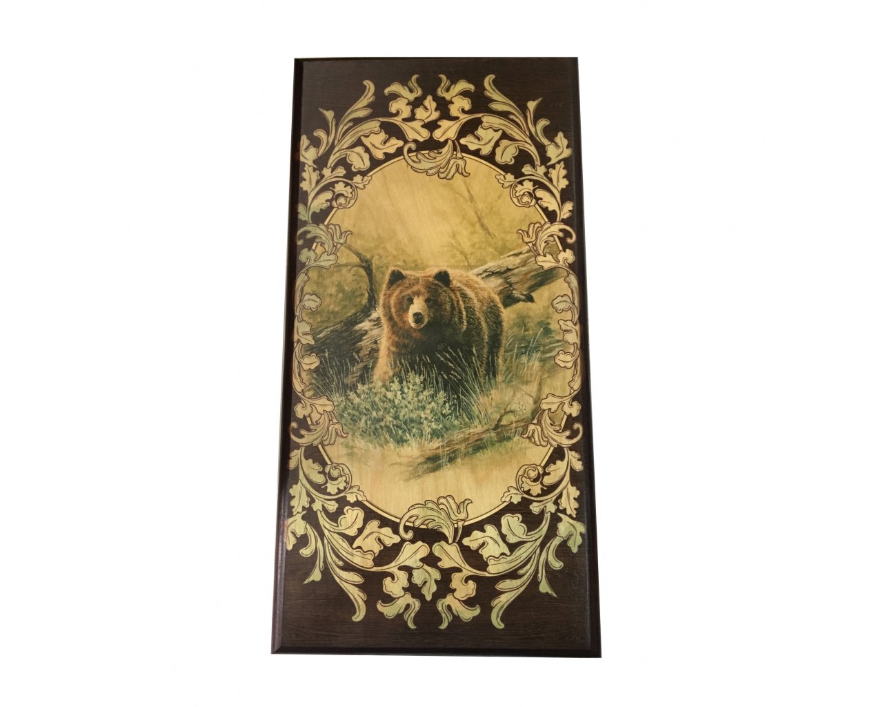 Нарды упакованы в деревянный лакированный кейс, декорированным изображением. Кейс закрывается на металлический замок. Внутренняя часть кейса представляет собой игровое поле. В наборе - 2 игральных кубика и деревянные шашки. На внешней стороне кейса изображено игровое поле для игры в шашки.