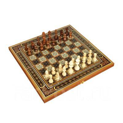 В комплект входят доска, шахматные фигуры, фишки для нард (30 шт), шашки, кубики 2 шт.