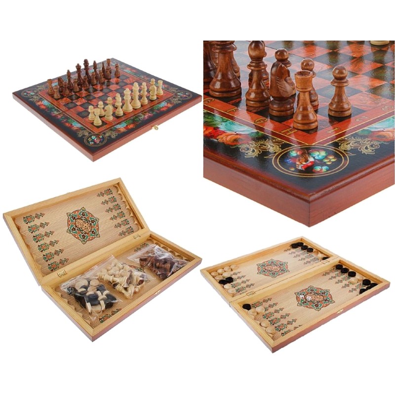 В комплект входят доска, шахматные фигуры, фишки для нард (30 шт), шашки, кубики 2 шт.
