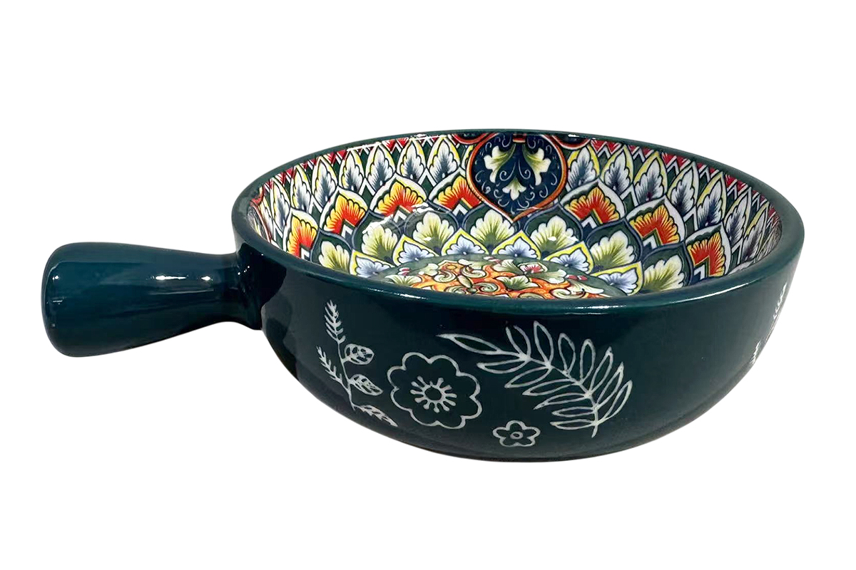 Салатник выполнен из высококачественного фарфора и декорирован интересным цветным принтом. Изделие представлено в круглой форме и имеет удобную ручку.