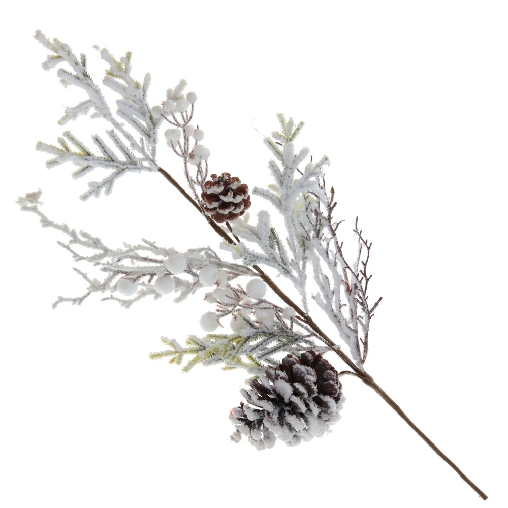 Декоративная ветка изготовлена из полимерных материалов и дополнена заснеженными декором. Можно использовать для новогоднего и рождественского декорирования дома. Будет прекрасно сочетаться с самыми разными ветками и цветами в интерьерных композициях, а так же на елке.
