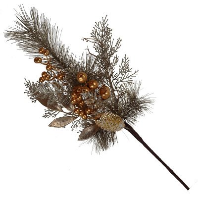 Декоративное изделие выполнено из качественных материалов и на долгое время сохранит свой первозданный вид. Украшение представлено в виде веточки с золотым декором и может выполнить роль неповторимого новогоднего букета, если разместить несколько веточек в вазе.