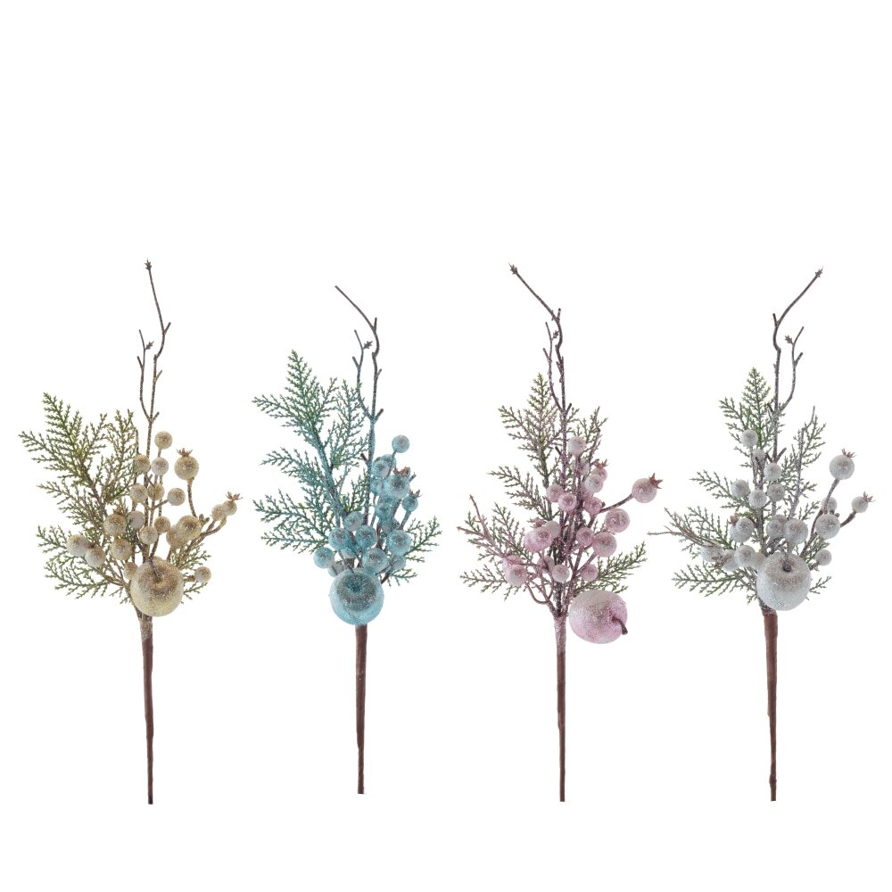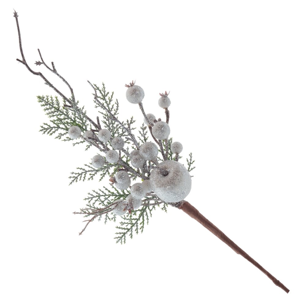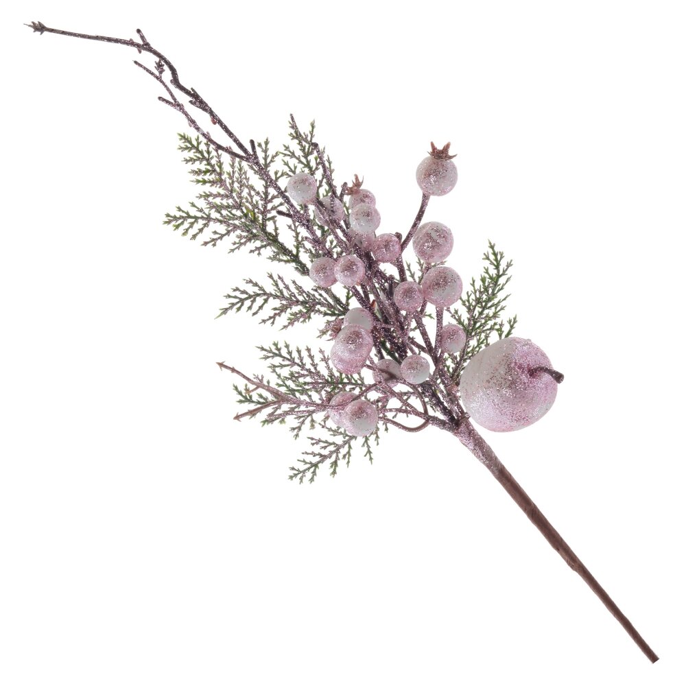 Декоративная ветка изготовлена из полимерных материалов и дополнена мерцающими глитерными листьями. Можно использовать для новогоднего и рождественского декорирования дома. Будет прекрасно сочетаться с самыми разными ветками и цветами в интерьерных композициях, а так же на елке.