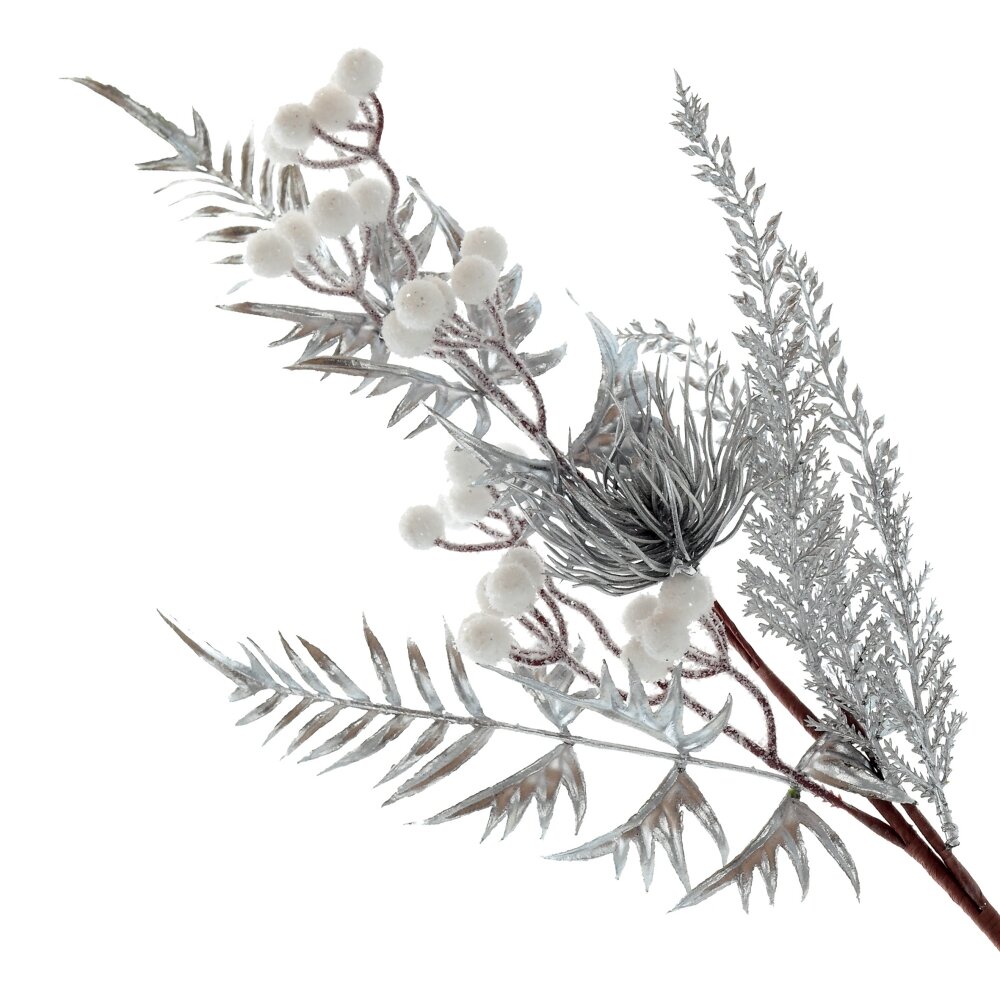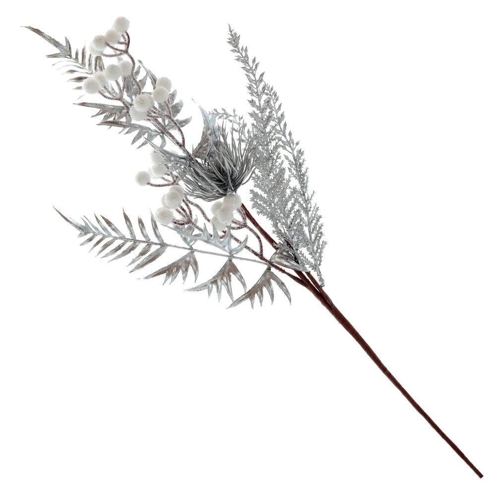 Декоративная ветка изготовлена из полимерных материалов и дополнена мерцающими глитерными листьями. Можно использовать для новогоднего и рождественского декорирования дома. Будет прекрасно сочетаться с самыми разными ветками и цветами в интерьерных композициях, а так же на елке.