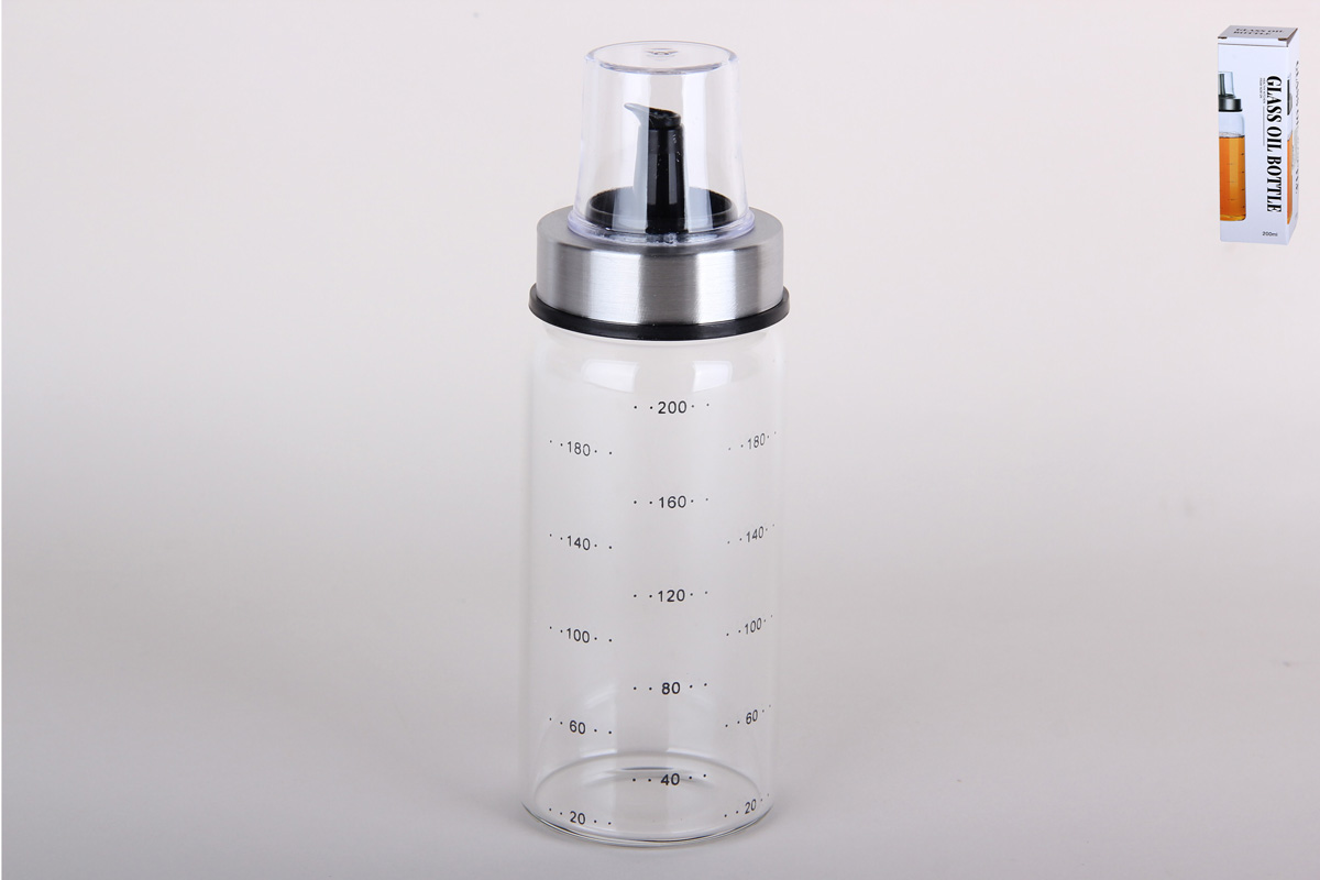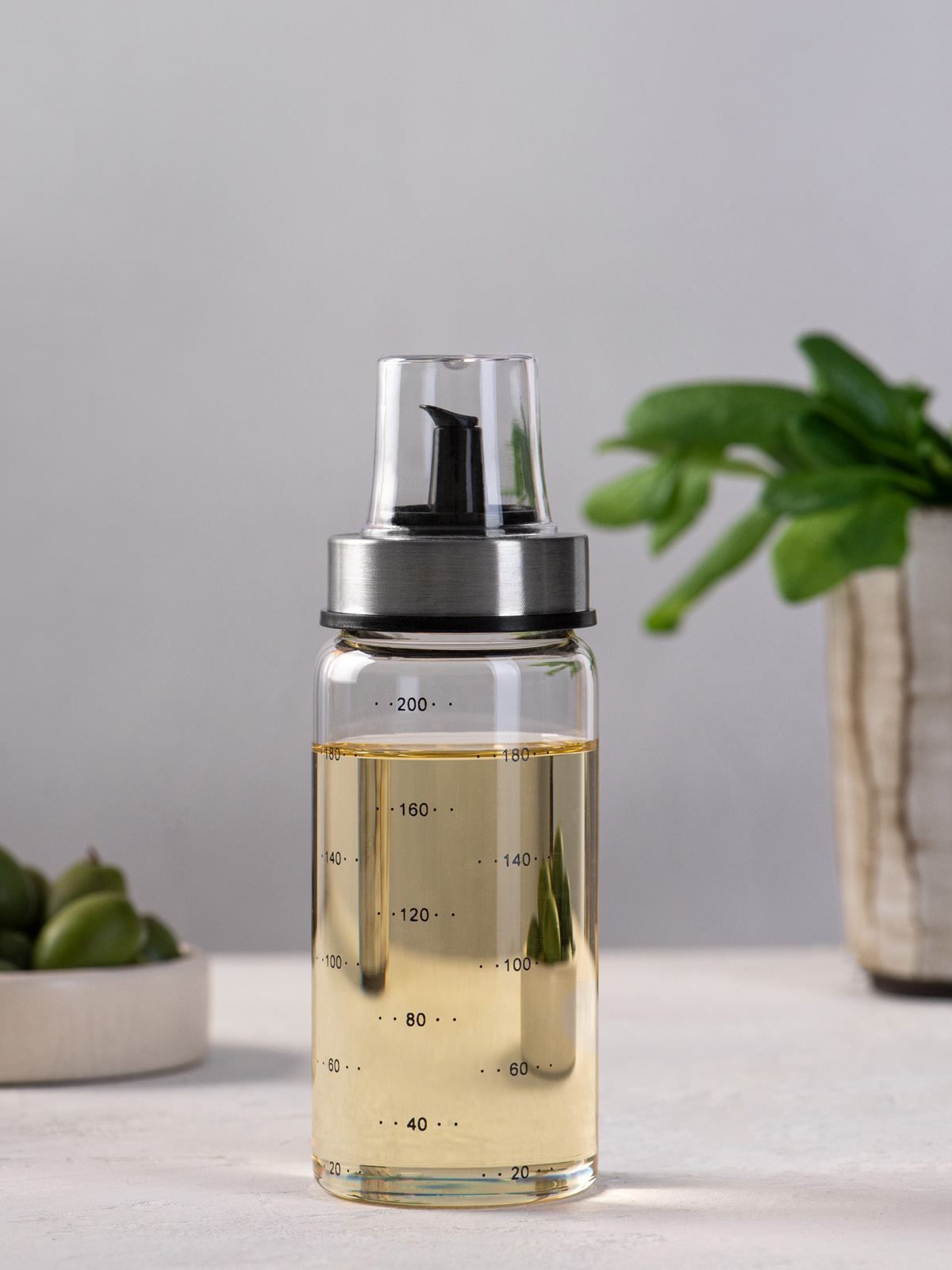 Бутылка для масла изготовлена из стекла. Изделие прекрасно подойдет для хранения и красивой подачи масла и уксуса или соевого и рыбного соусов. В стеклянных сосудах любая продукция хорошо сохраняет свои полезные свойства.