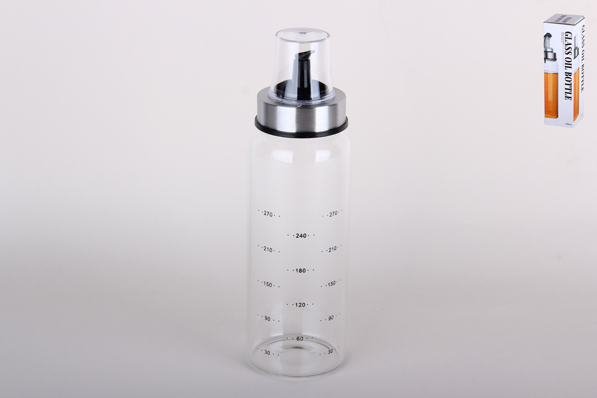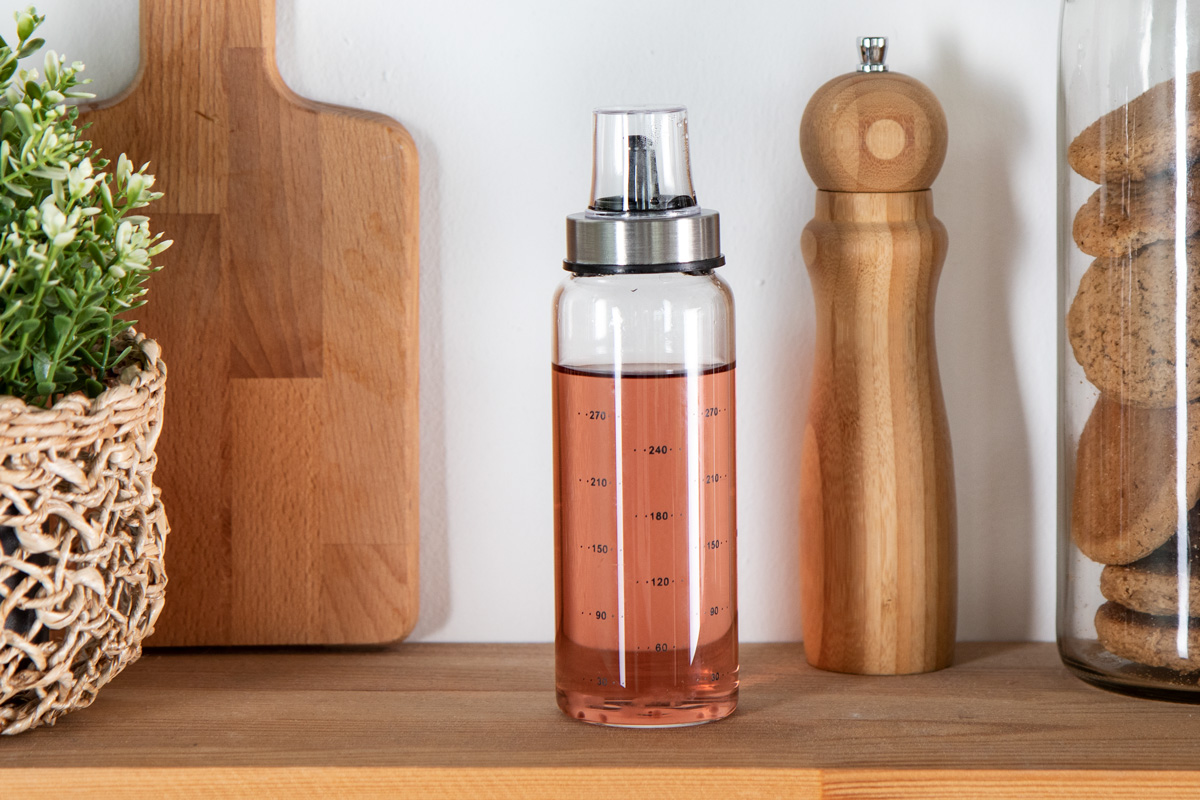 Бутылка для масла изготовлена из стекла. Изделие прекрасно подойдет для хранения и красивой подачи масла и уксуса или соевого и рыбного соусов. В стеклянных сосудах любая продукция хорошо сохраняет свои полезные свойства.
