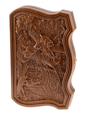 Нарды "Мишки в лесу" упакованы в деревянный кейс из массива бука. Специальное покрытие патиной придает изделию эффект благородной старины и защищает от истирания. Лицевую сторону украшает резьба с сюжетом известной картины "Утро в сосновом лесу". Внутри кейса игровое поле с оригинальным узором.